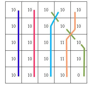 В случае, если минимальное время выполнения работы на нескольких путях одинаково, наибольшим преимуществом наделено направление «вниз» (см. рис.), затем «вниз и влево» и, наконец, «вниз и вправо». Если два или более волонтеров одновременно хотят занять одну клетку, то наибольшее преимущество имеет тот, кто стартовал со столбца с меньшим номером.